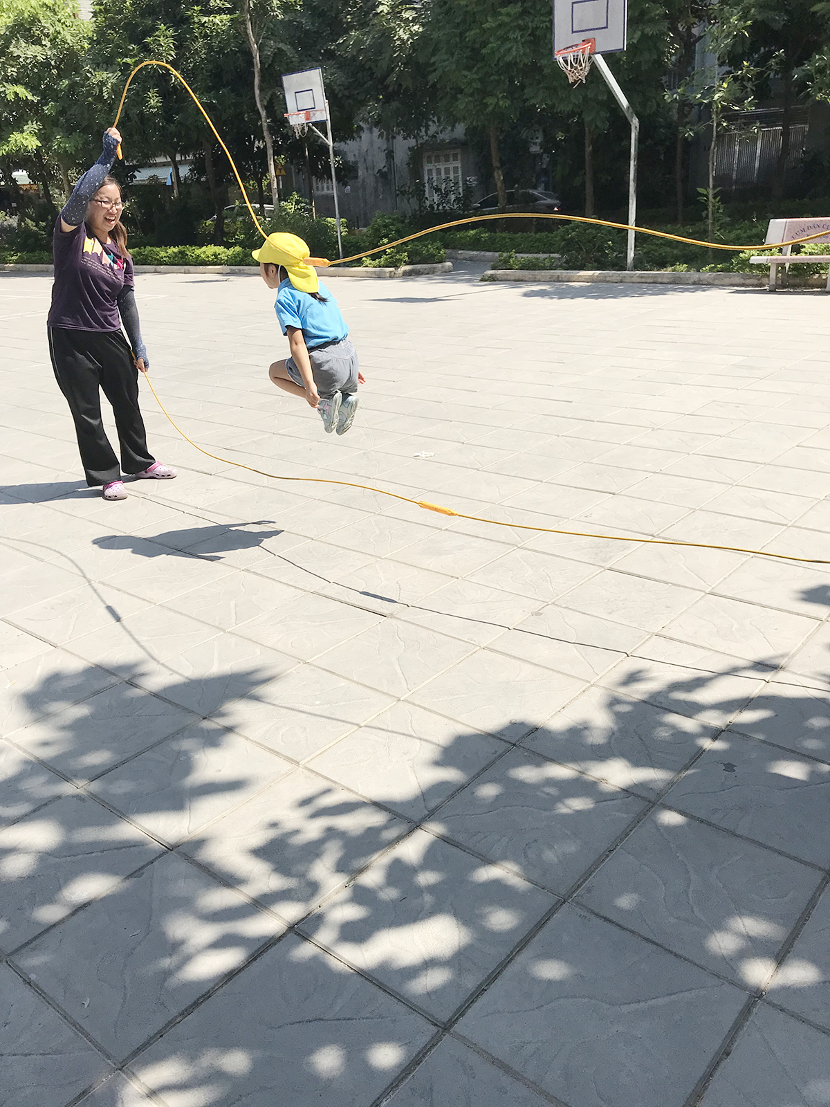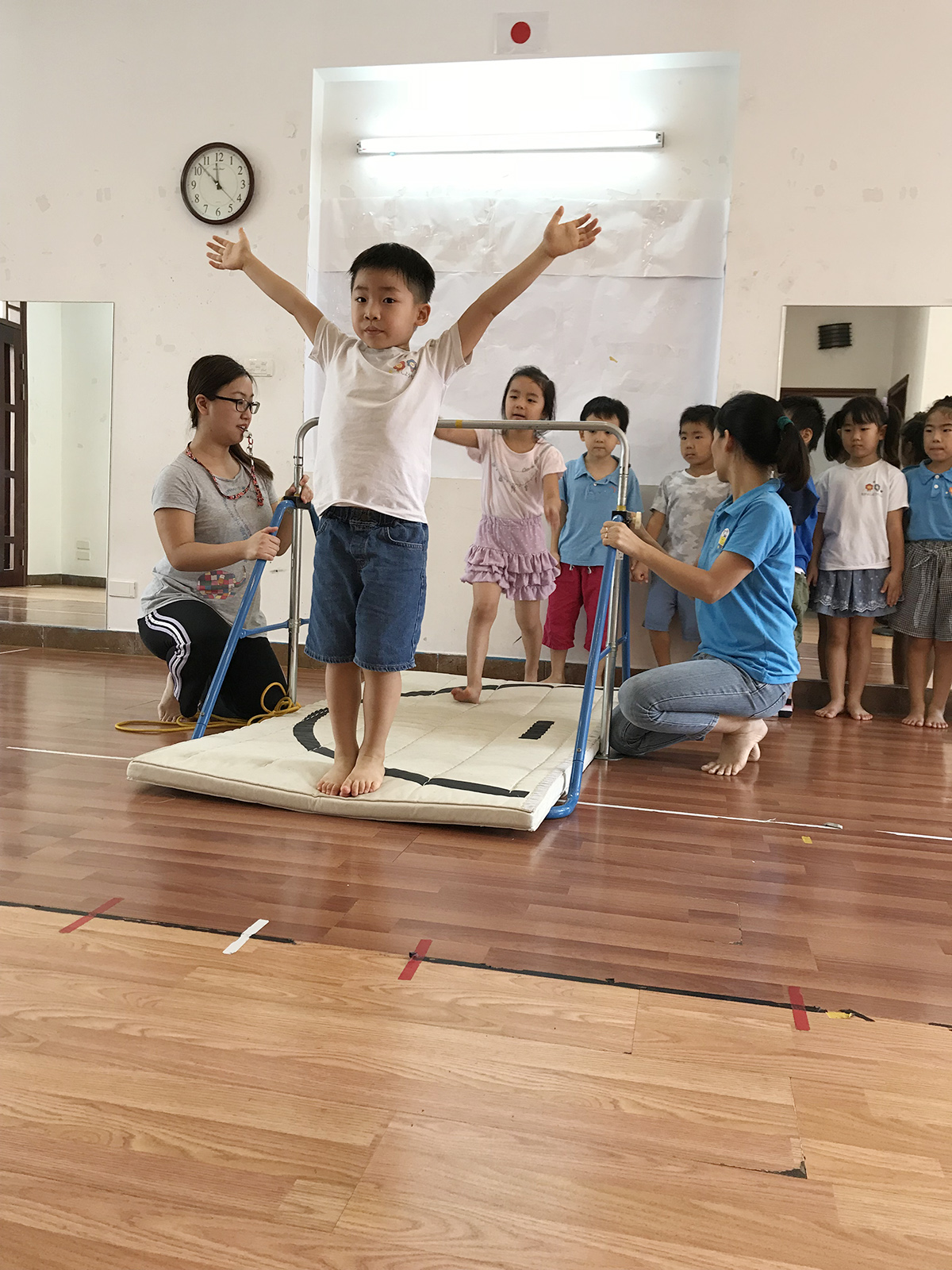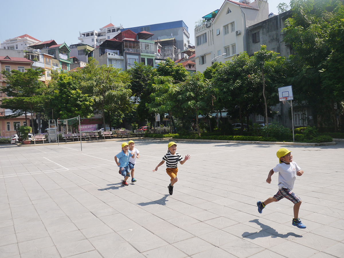 脳は心のありかです。脳科学では、「幼児の脳が一番発達するのは、友達と楽しく運動をするとき」という研究結果があります。また、適度な運動で「成長ホルモン」と、「セロトニン」という精神を安定させる癒しのホルモンが分泌されます。昼間の運動量が少ないと、セロトニンが減ってイライラしたり、不安定になったり、切れやすくなったりします。また、セロトニンの不足は記憶力にも悪影響を与えます。セロトニンは日光を浴びるとたくさん分泌されます。本園では外で体を動かすことを重要視し、ハノイで一番運動をする園を目指して、スイミング、器械体操、剣道など様々な運動遊びを実施しています。