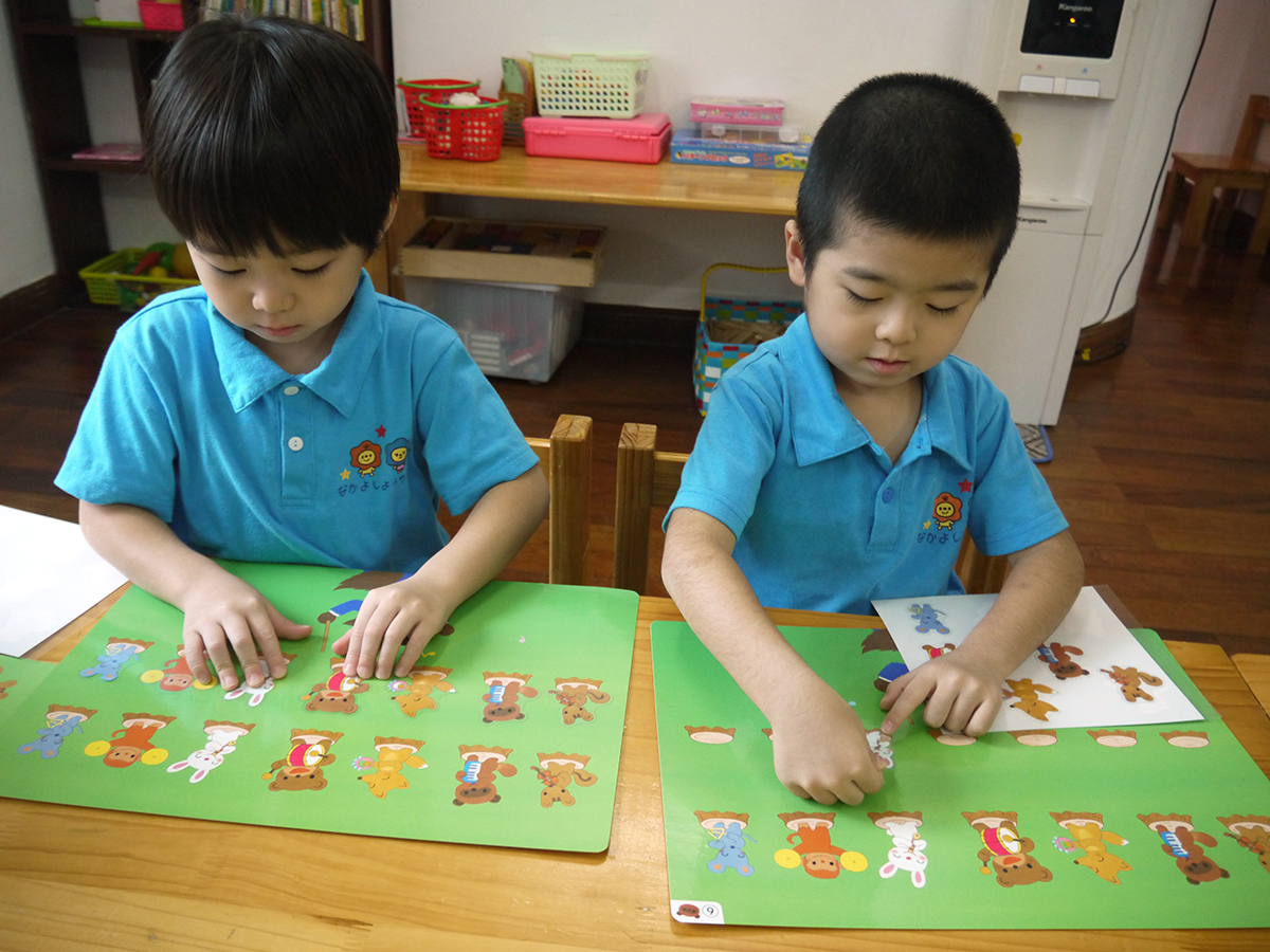 園では、ピアジェ理論に基づいた教育を、特別教材『かず・ことば ぺたぺたシールあそび』を利用しながら実践します。『かず・ことば ぺたぺたシールあそび』は何度も貼ったり剥がしたりでき、失敗することを恐れず、楽しく繰り返すことができます。